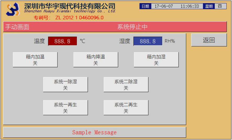 手動(dòng)畫面:手動(dòng)打開或關(guān)閉系統(tǒng)單項(xiàng)功能模塊。需要一級密碼進(jìn)入。