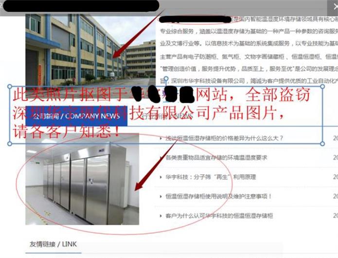 深圳市華宇現(xiàn)代科技有限公司擁有一項恒溫恒濕存儲柜國家發(fā)明專利,和多項相關(guān)的結(jié)構(gòu)新型及軟著專利。產(chǎn)品廣泛用于外資企業(yè),大企業(yè),企業(yè)集團,軍工,醫(yī)藥,博物館,檔案館。最近發(fā)現(xiàn)市面有很多貿(mào)易公司或五金生產(chǎn)廠家,在線下或網(wǎng)絡(luò)上盜用我司的產(chǎn)品資料及圖片進行不良銷售活動。更有甚者以華宇現(xiàn)代的品牌私下接單,但實際銷售的產(chǎn)品卻是不具備恒溫恒濕功能的非我司產(chǎn)品?。ɡ绾蜕钲谑腥A宇現(xiàn)代科技有限公司相似名稱來取名以混淆客戶,更有甚者,其網(wǎng)上全部圖片盜用華宇現(xiàn)代產(chǎn)品圖片,以蒙騙客戶(可以進入華宇現(xiàn)代官網(wǎng)m.dianzixianshu.cn比較即知))